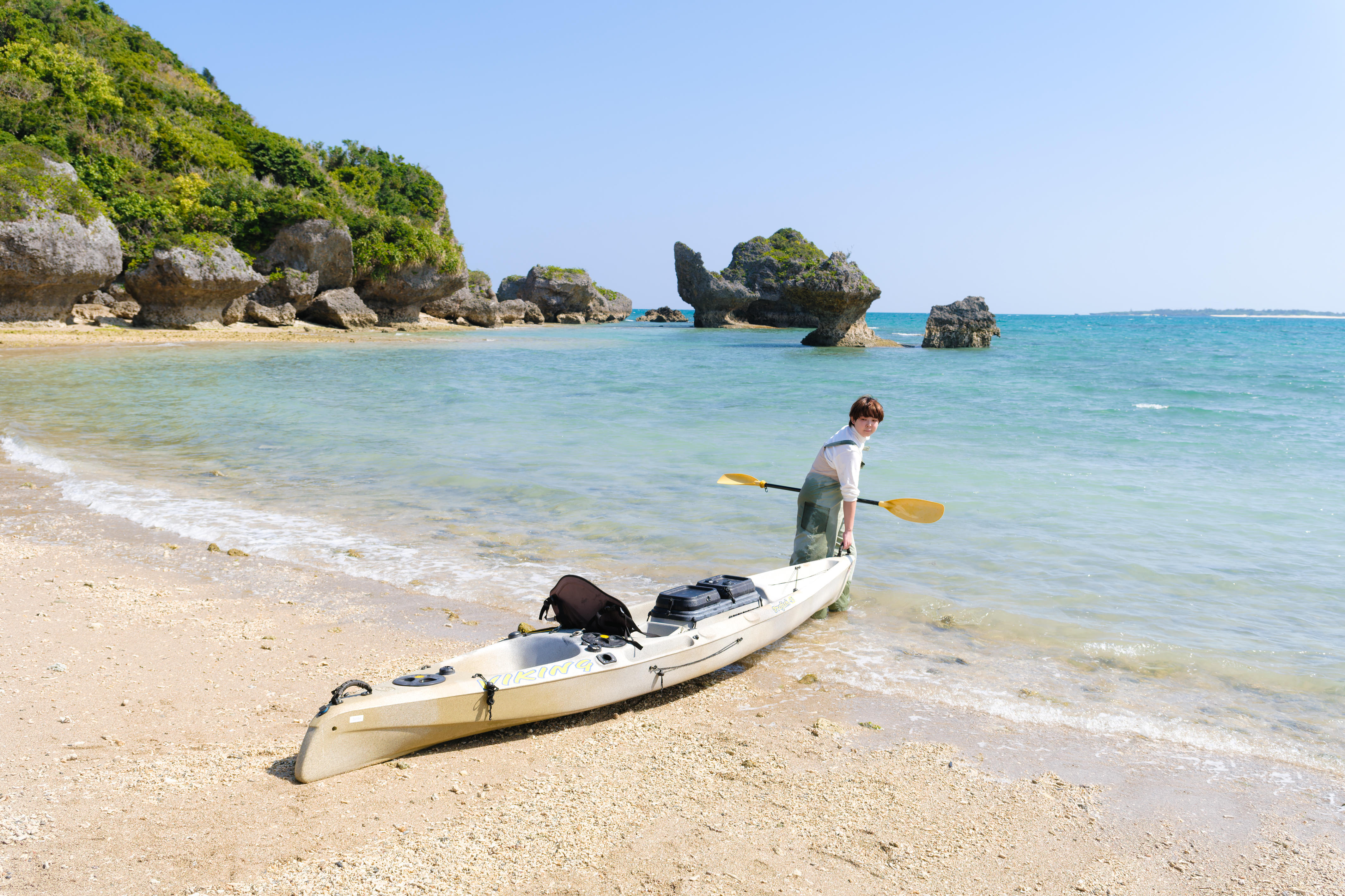 浜比嘉島の海に到着したら、まずはカヤックに乗るHaoさん。太陽の光を受けてきらきらと光る海で、気ままにカヤックを漕ぐ時間は最高のくつろぎタイム。洋服が濡れるのを気にせずに、じゃぶじゃぶと海に入ってアクティビティを楽しみます。
