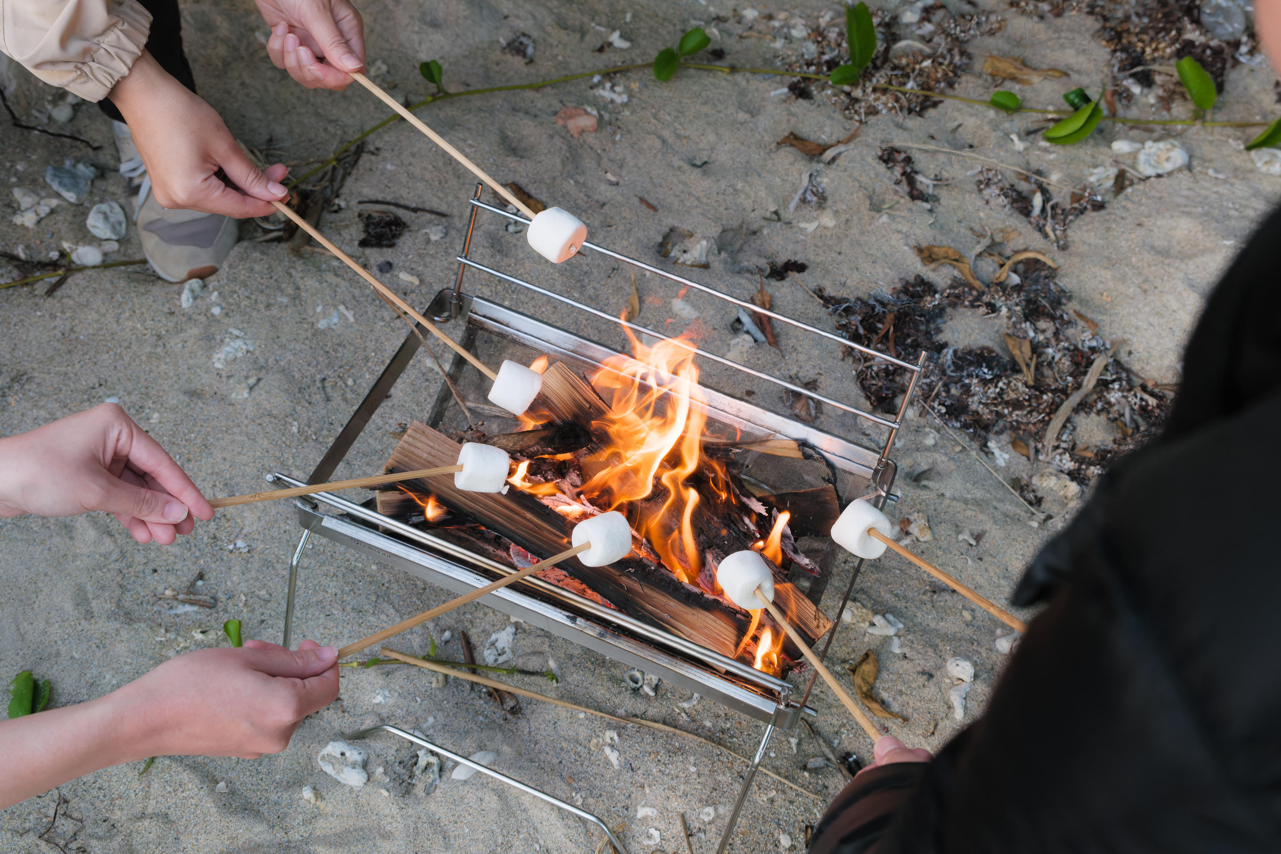 日も暮れてくると、Haoさんが慣れた手つきで薪をくべ、焚き火をしてチルタイム。炎のゆらめきやパチパチとした音、ふわっと香る焚き火の匂いも好きだというHaoさん。しばらく焚き火を楽しんだら、マシュマロを焼いてビーチパーティーを締めました。