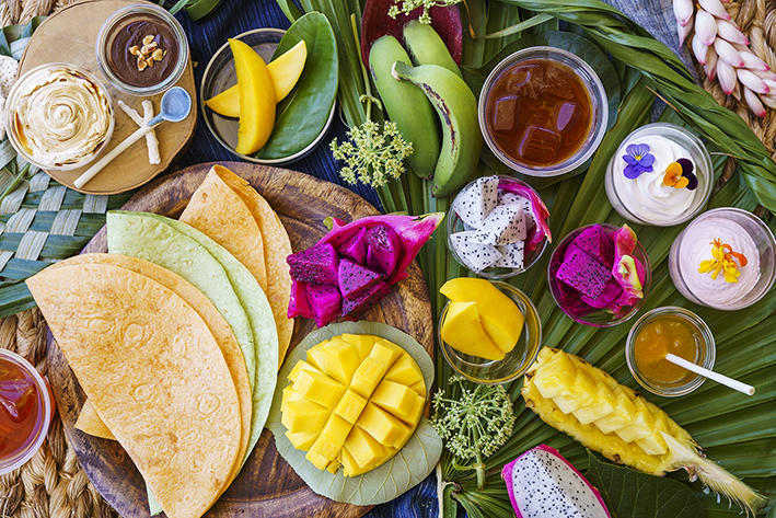 1日 10 セット 限定。その日に食べごろを迎える7種類のフルーツから好きなフルーツを選び、ヨーグルトクリームやジャムなどのソースと一緒に、トルティーヤでくるりと巻いて味わいます。マンゴーは、「アーウィン」や「ヘイデン」など10種類以上の品種が栽培されているため、食べ比べも楽しめます。