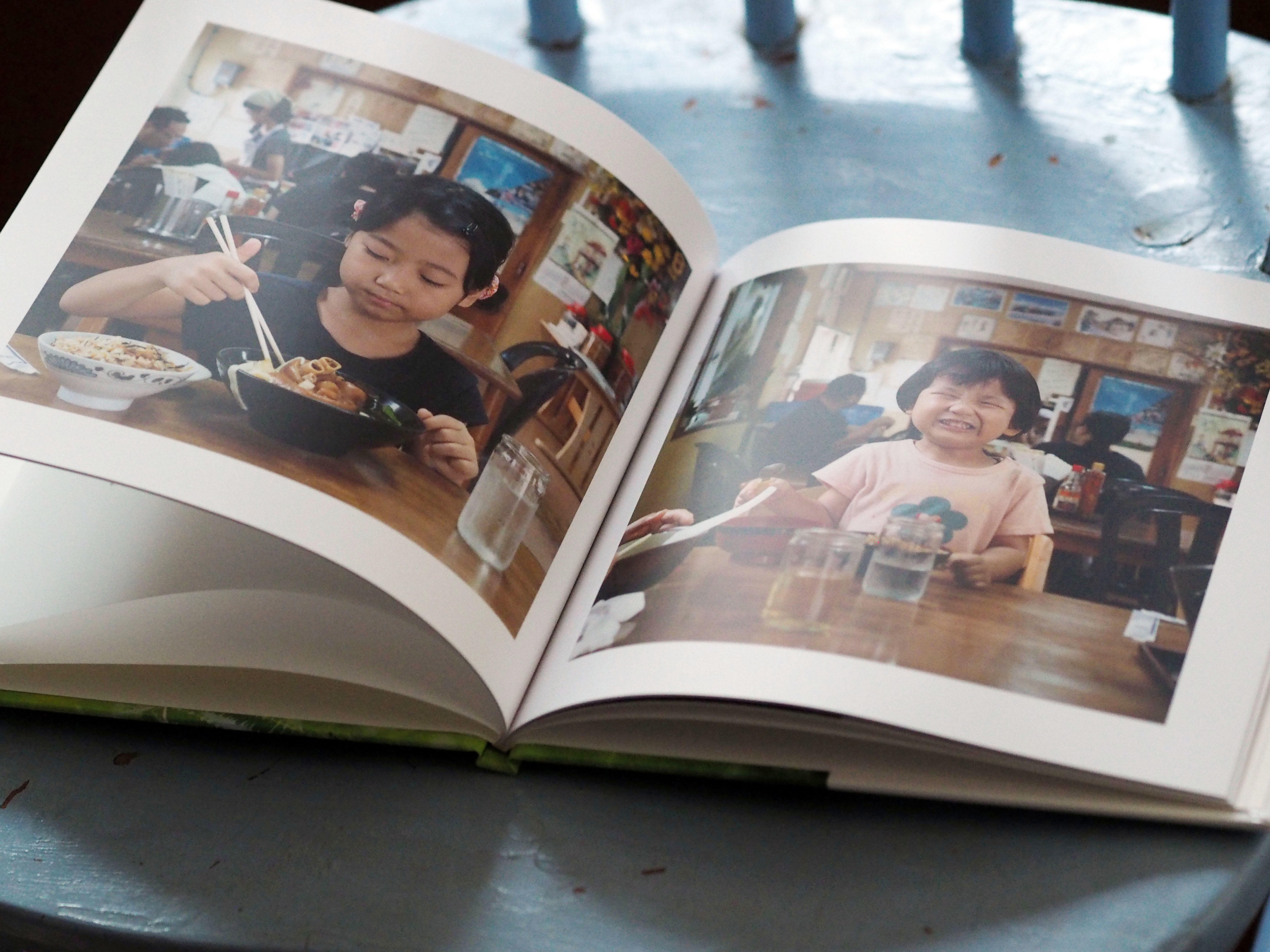 見開きでダイナミックに配置したり、小さな写真で組み合わせたりと、リズム感も考え構成していく。あそこのページにこんなシーンを盛り込みたいと、思いついたら二人を誘って、ビーチやおそば屋さんなどに行って撮影するなど、写真集の制作を楽しんだ。