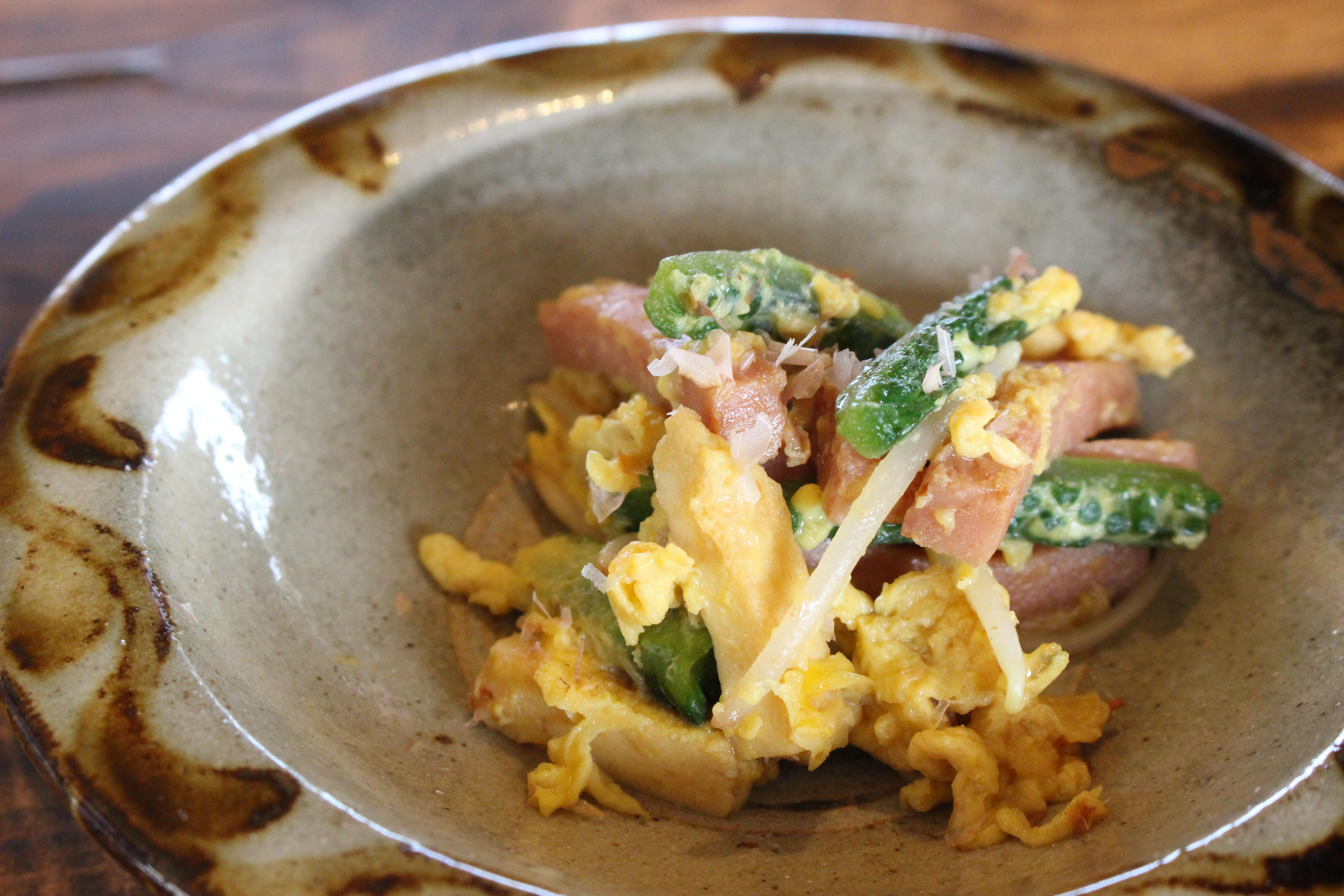 一見すると、普通のゴーヤーチャンプルーも、神田さんのアイデアが光る。味のつき方や火の通りを均等にするために、ゴーヤーや島豆腐、スパムなどの食材を縦にカットしているのだ。出汁で炒め煮をしたゴーヤーチャンプルーは、食材に出汁がしっかりとしみていて、半熟たまごとあいまって最後までとてもジューシーにいただける。ゴーヤーの苦さはちゃんと感じられるのに青臭さはないので、初めてゴーヤーを食べるという人にもおすすめだ。