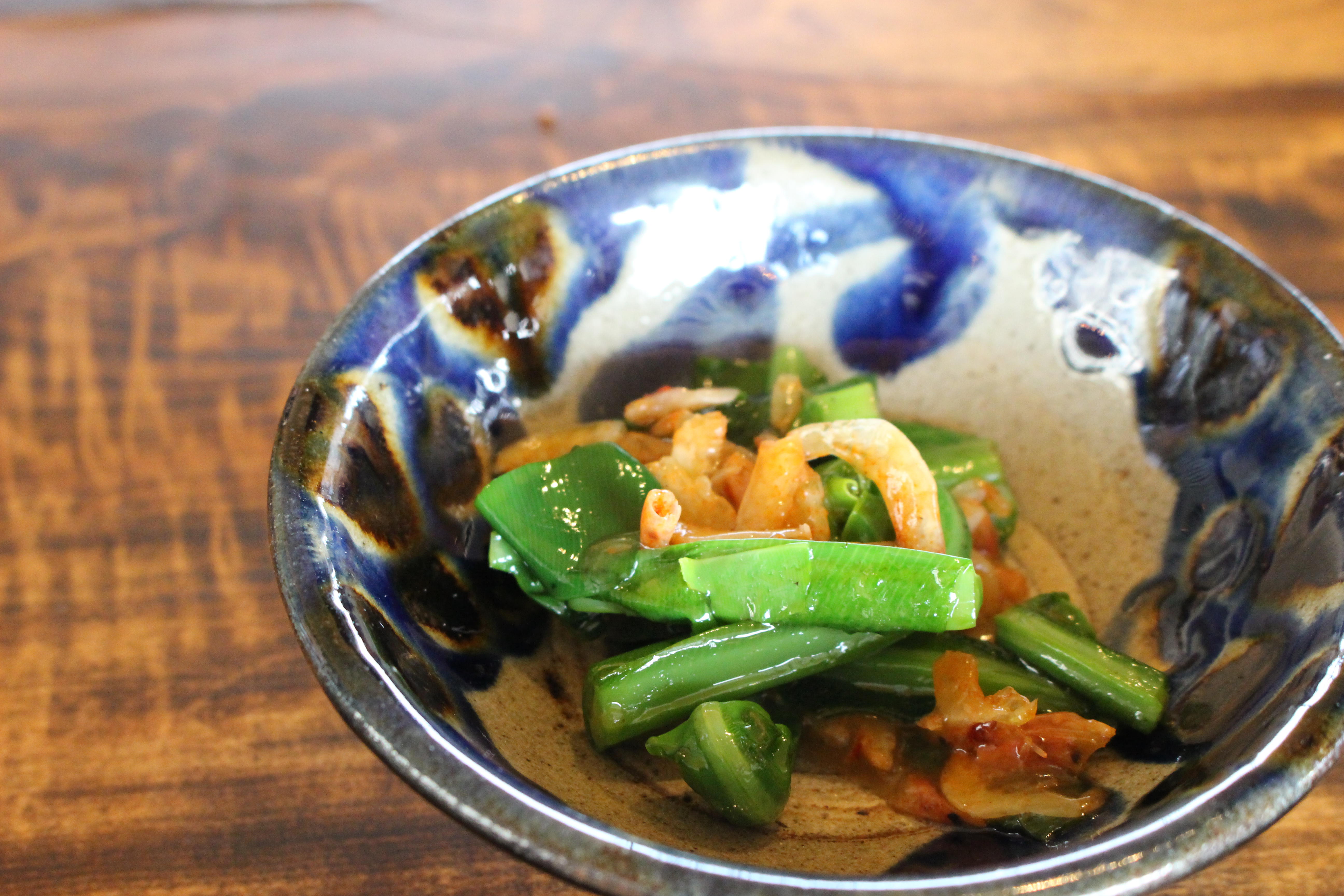 八重山地方でよく天ぷらにして食されるオオタニワタリの新芽は、さっと炒めて桜海老をあわせる。とてもシンプルなのに味わいぶかく、食材本来の美味しさが際立っている。