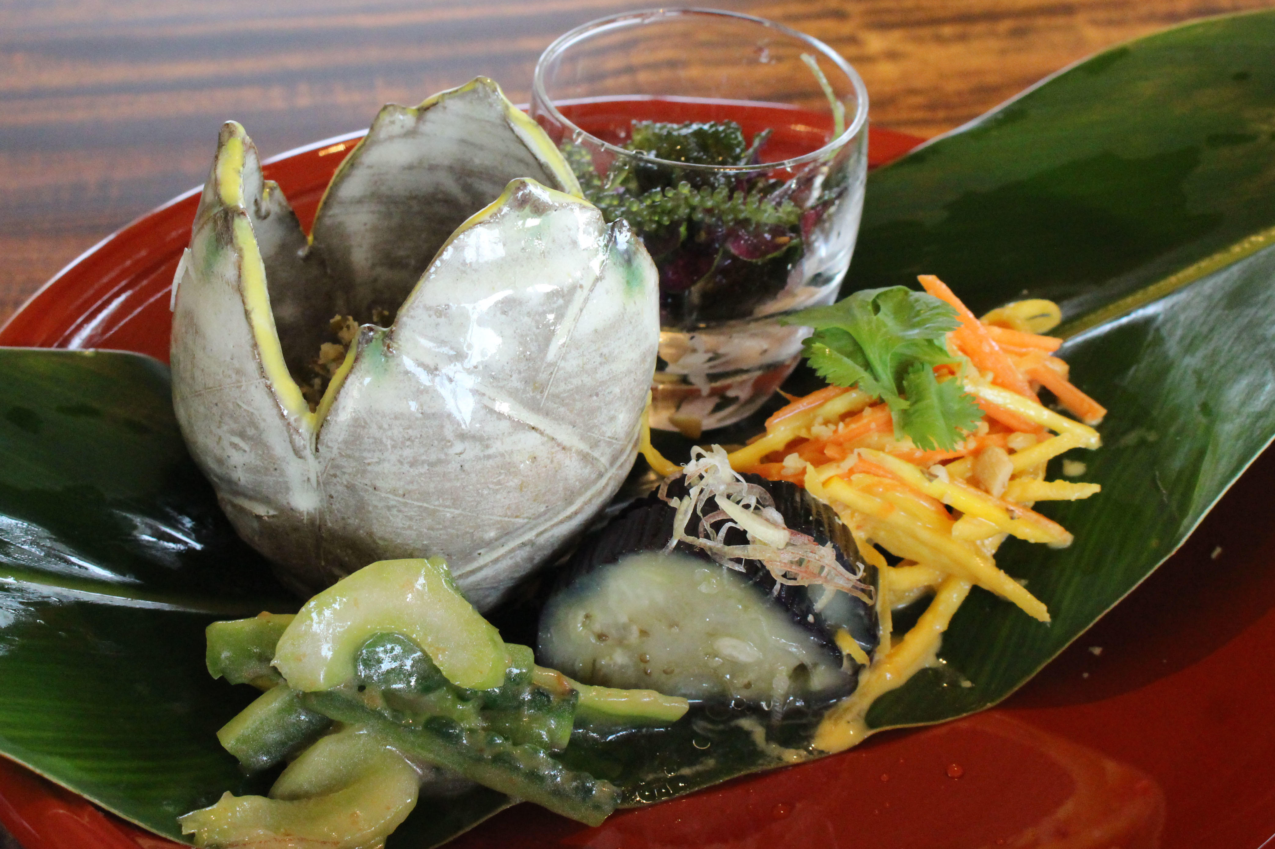 「"僕なりの沖縄料理"ですね。まずは食べてみてください」と、サーブされたお皿には、美しく盛り付けられた前菜。「前菜はあえて野菜だけ。沖縄料理って豚肉を多く使うから、最初はさっぱりと召し上がっていただきたくて。でも、食べ応えは十分ですよ」。その中には、沖縄の人に馴染み深い"人参しりしり"も。普通なら油で炒めていただくことが多いが、黄色い島人参とオレンジの和人参をミックスさせ、見た目も鮮やかなサラダ仕立てでいただく。パクチーの香りがアクセントになっていて、新しい味わいと食感に驚く。