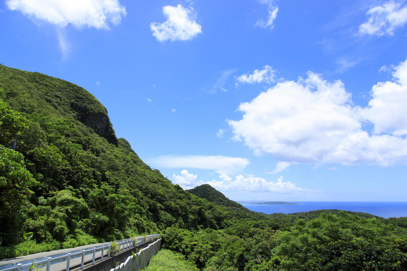 思わず車を停めて眺めたくなった山の緑と青い海空のコントラスト。