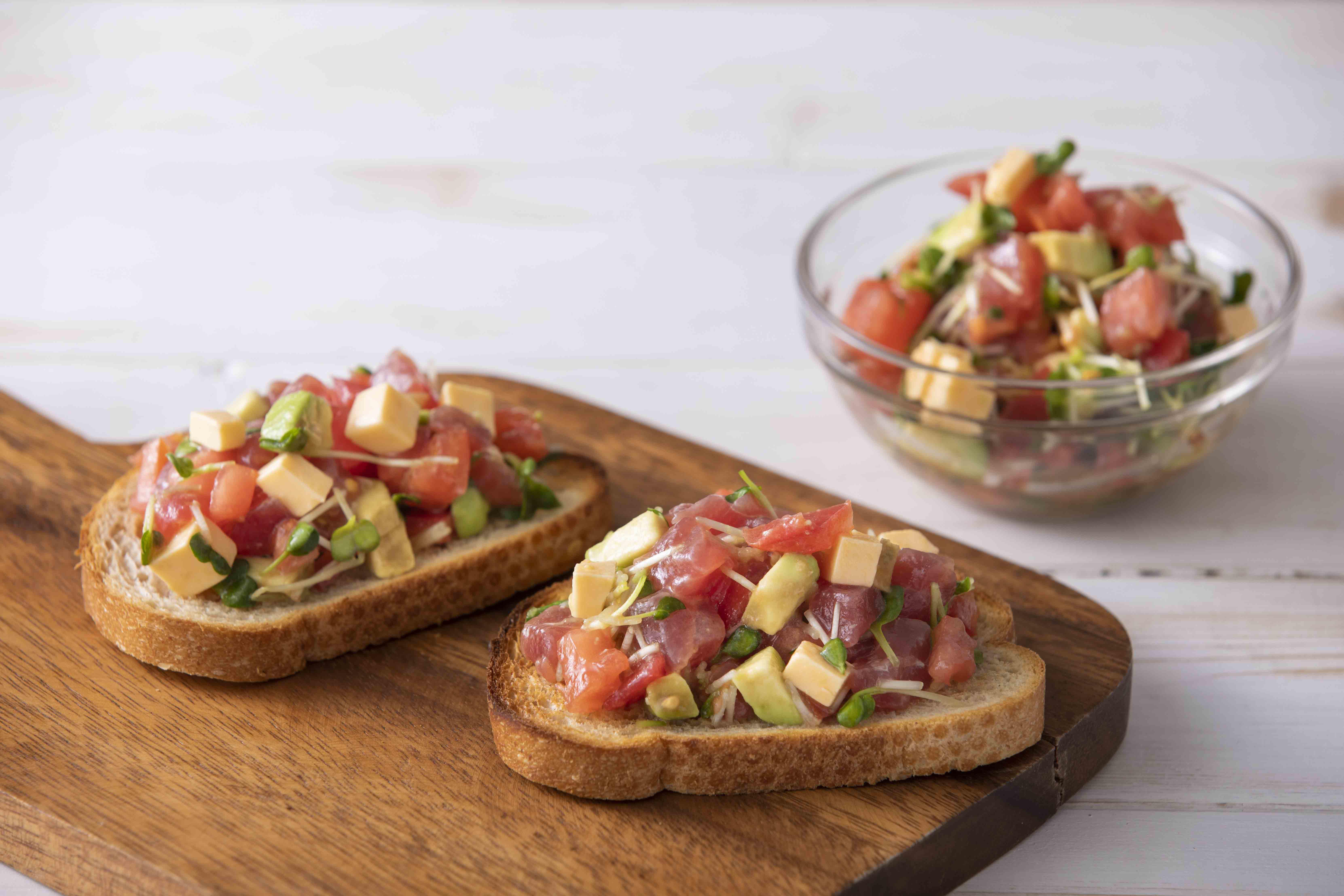 新鮮な生のマグロを使った、マグロのタルタルブルスケッタ。実は沖縄県は、冷凍されない生鮮マグロが食べられる全国的にも珍しいところなんです。