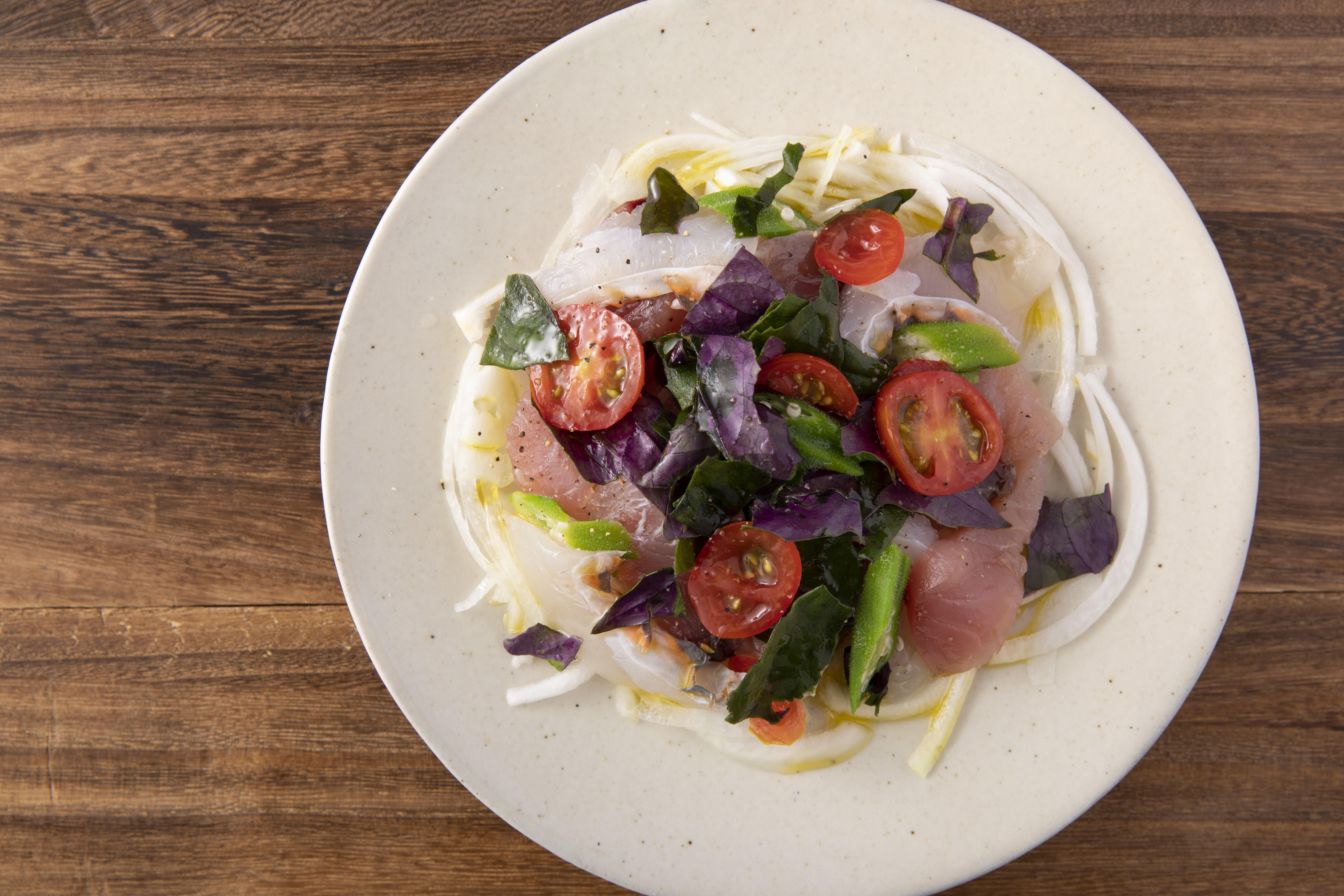 緑と紫のコントラストがきれいなハンダマ(水前寺菜)はカルパッチョに添えるとグンと華やかな一皿に!