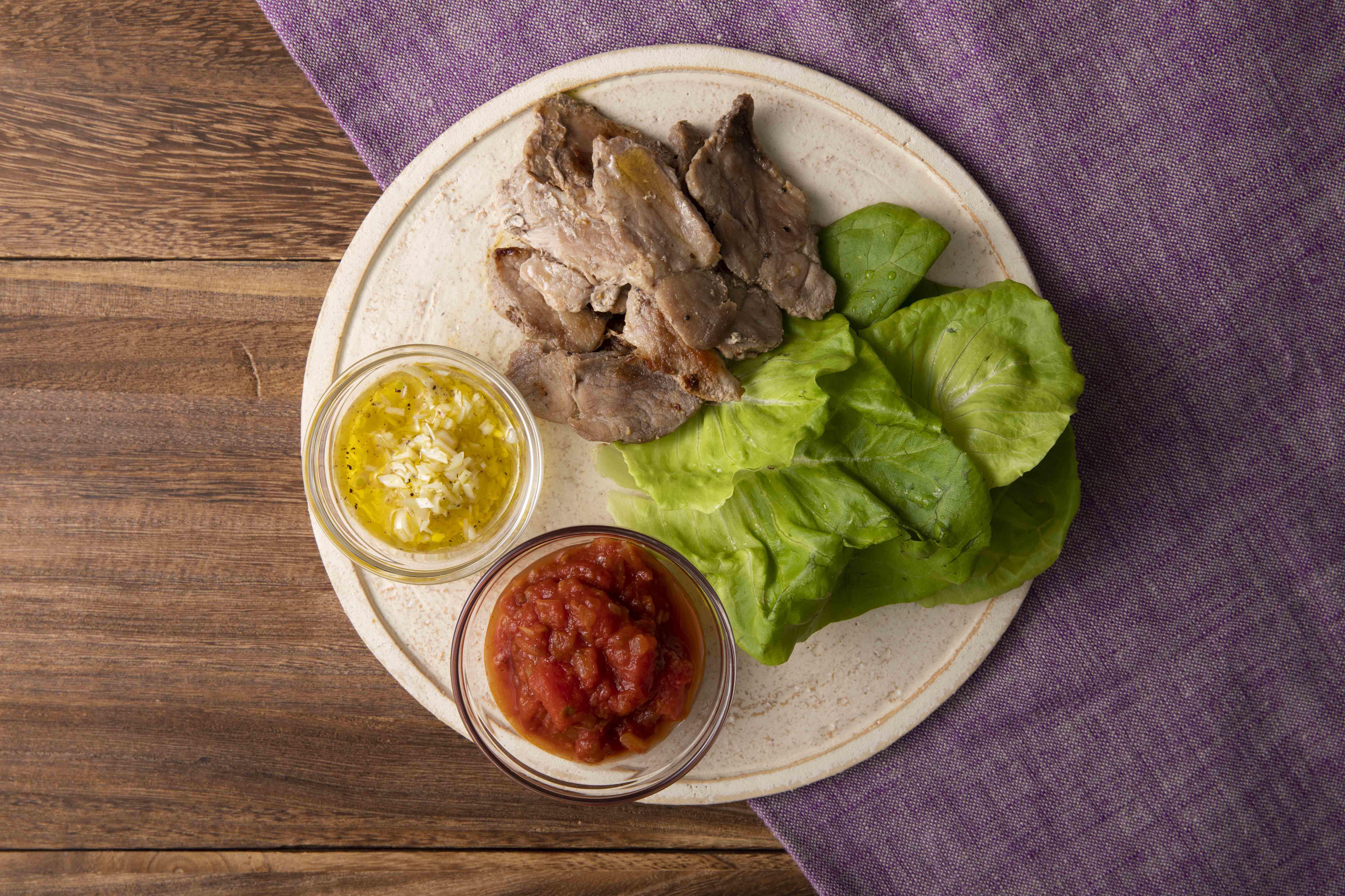 県産豚のサムギョプサル(韓国風豚バラ焼肉)。付け合わせは、島ラッキョウの塩レモンソース&県産トマトのピリ辛ソースと、野菜たっぷりでとてもヘルシー。