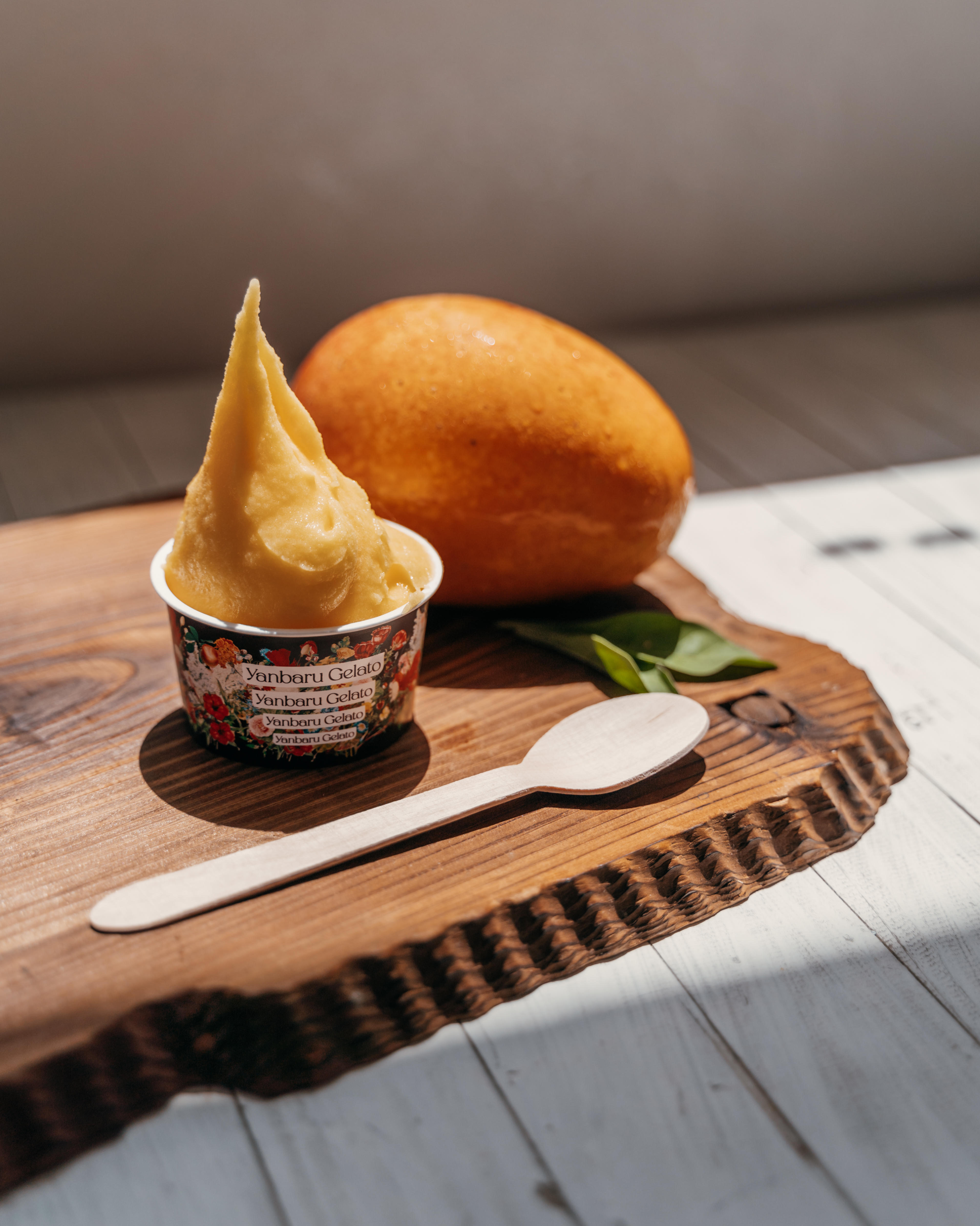 熟れて一番甘い状態のマンゴーの果肉をジェラートに。濃厚で甘く、酸味をほのかに感じる味わいで、ねっとりとした舌触りも魅力です。