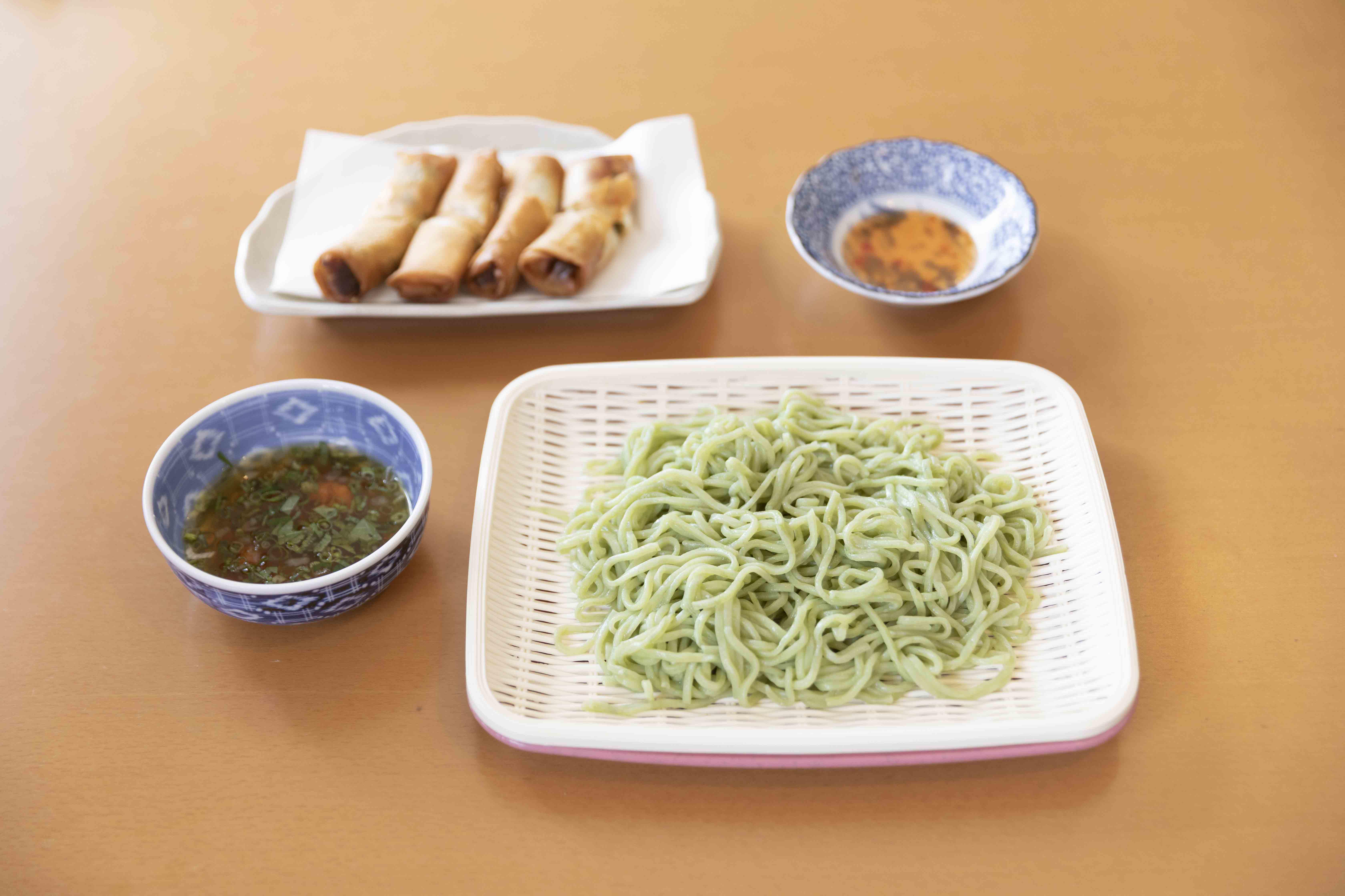 島に自生する菜の花"マーナ"を使ったそばと春巻きは居酒屋「ふばがさ」で。
