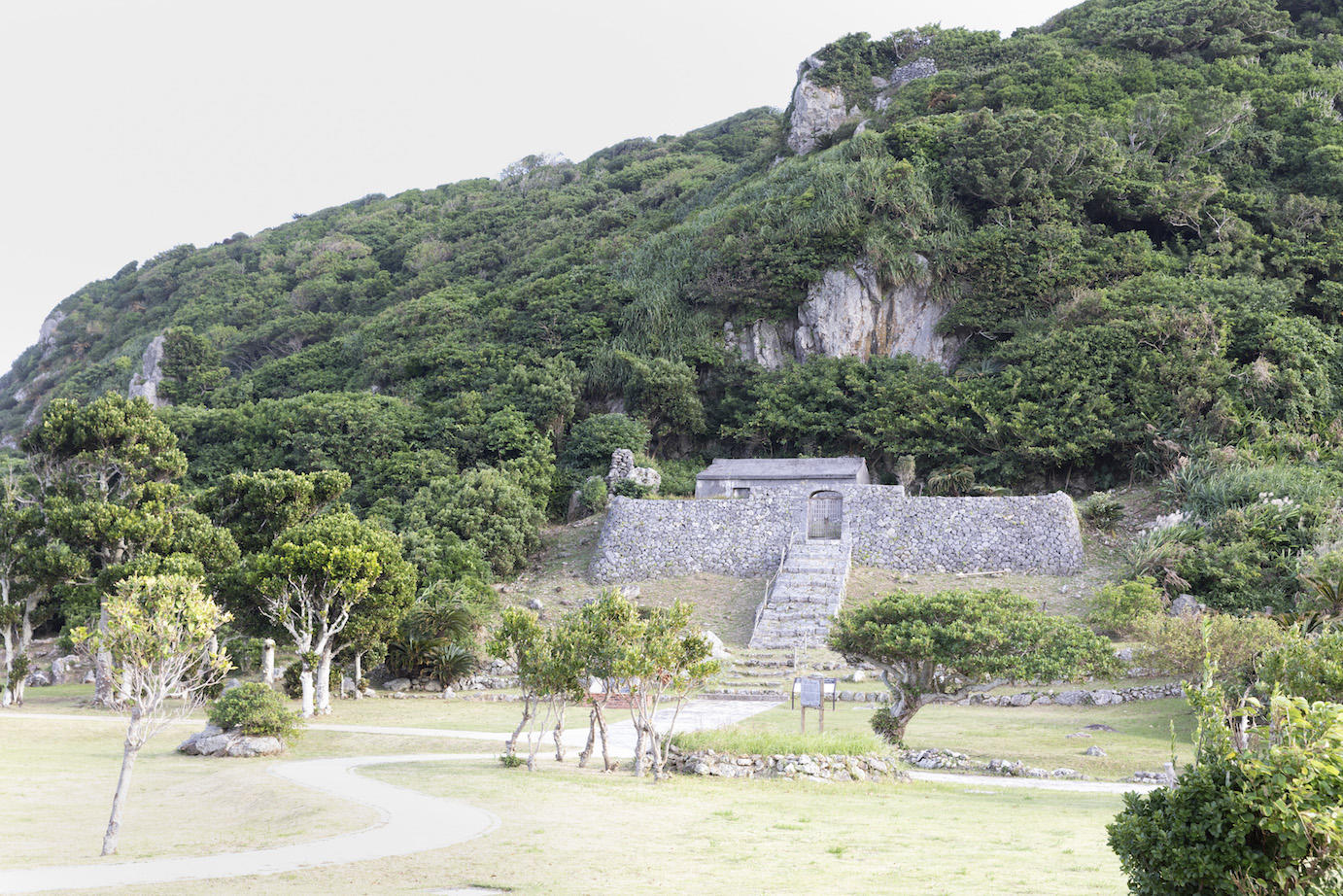 山全体が伊是名城跡。麓にあるのが王家の墓、「玉御殿(たまうどぅん)」。