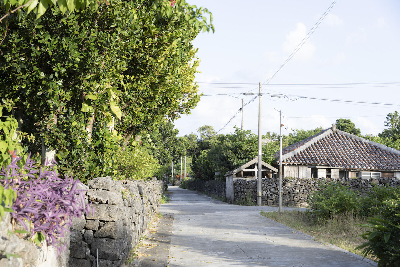 山の先にある小さな集落には、サンゴの石垣や赤瓦の古民家が並ぶ。