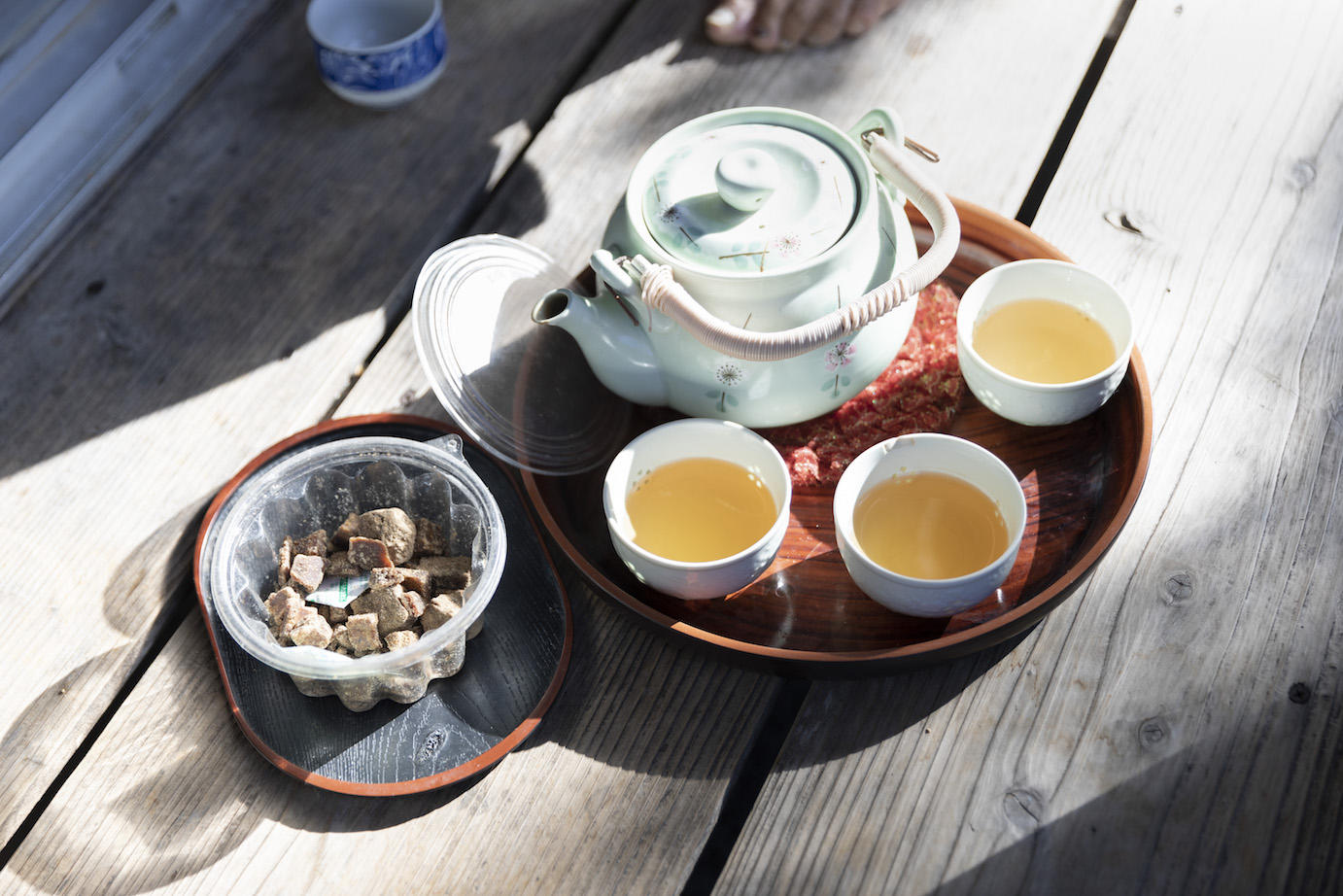 古民家の縁側にお茶と茶菓子。ご近所さんや訪ね人をもてなす「イヒャジューテー」の文化。