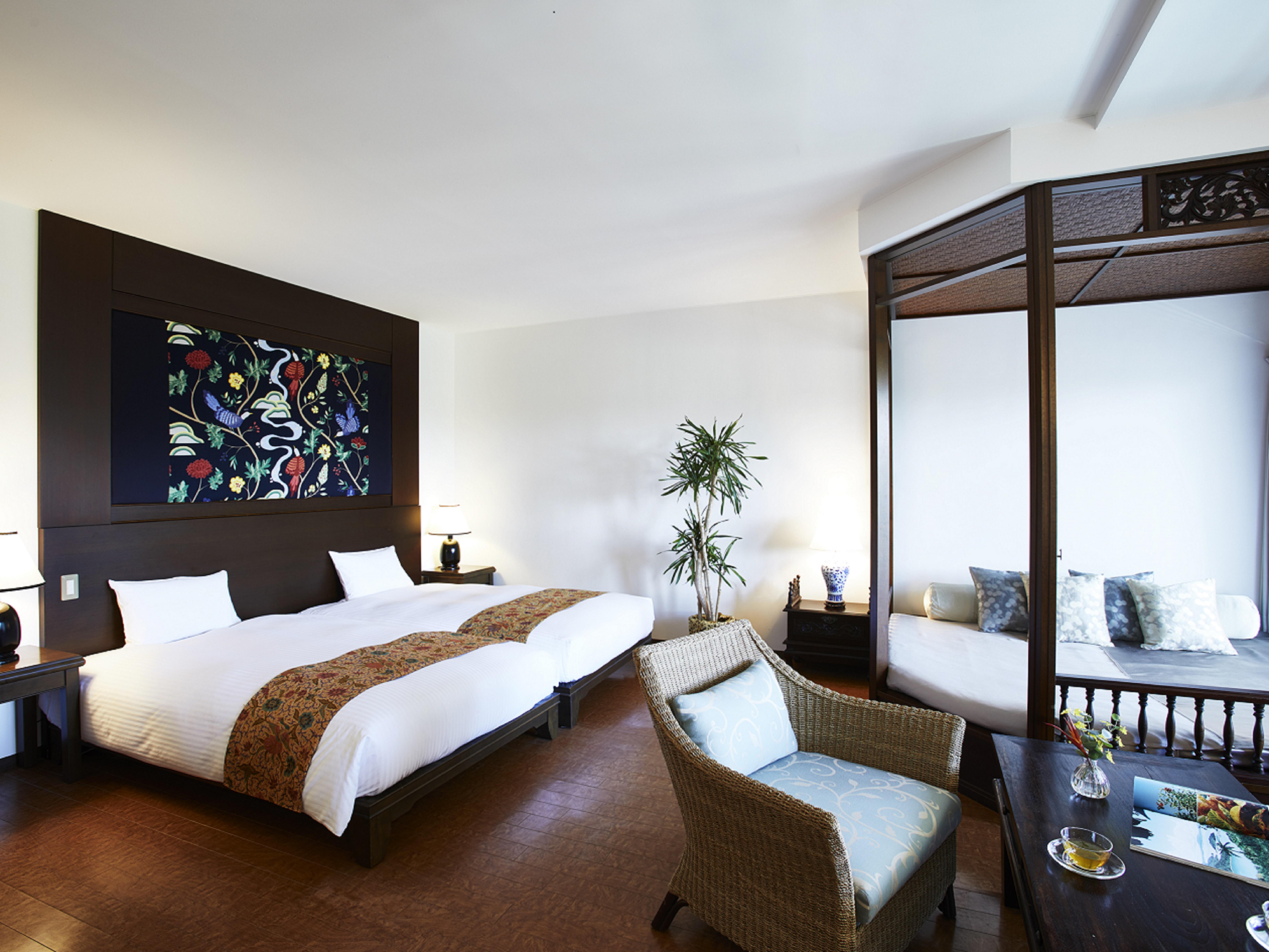 落ち着いた雰囲気の客室。デイベッドでのんびり。