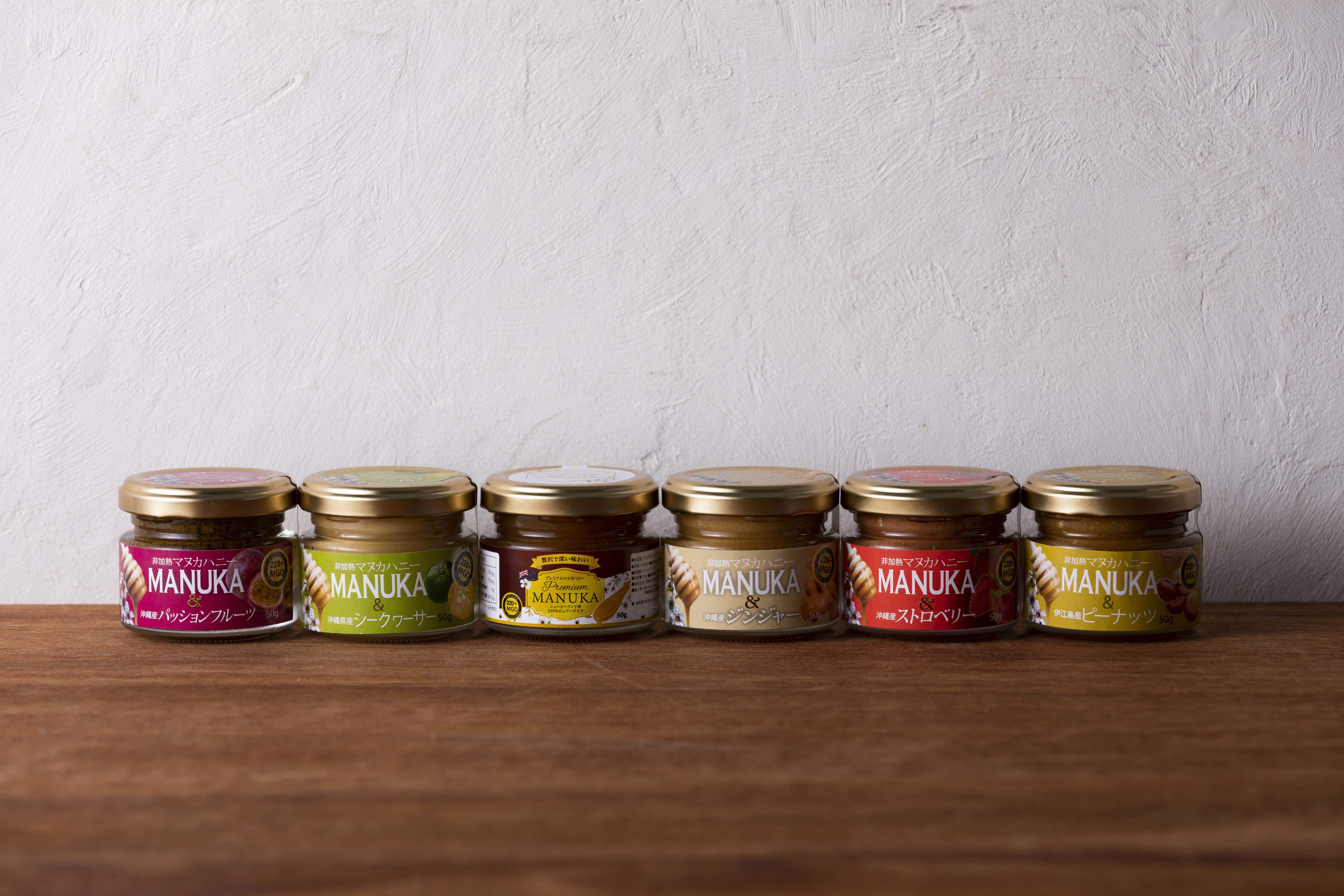 その中でも編集部の一押しは、Honey Fusion(ハニー フュージョン)のマヌカハニーシリーズ。マヌカハニーとは、ニュージーランドで採取される希少な蜂蜜のこと。一般的な蜂蜜とは違って、殺菌成分「メチルグルオキサール」を含み、腸内環境や口内環境を整える作用があるといわれるスーパーフードなのです。このマヌカハニーと県産素材をフュージョン(統合)させてできたのが、ハニーフュージョンのマヌカハニーシリーズ。「規格外の農産物に悩む沖縄の農家さんを応援したい」という想いから生まれた世界でも類を見ない逸品です。