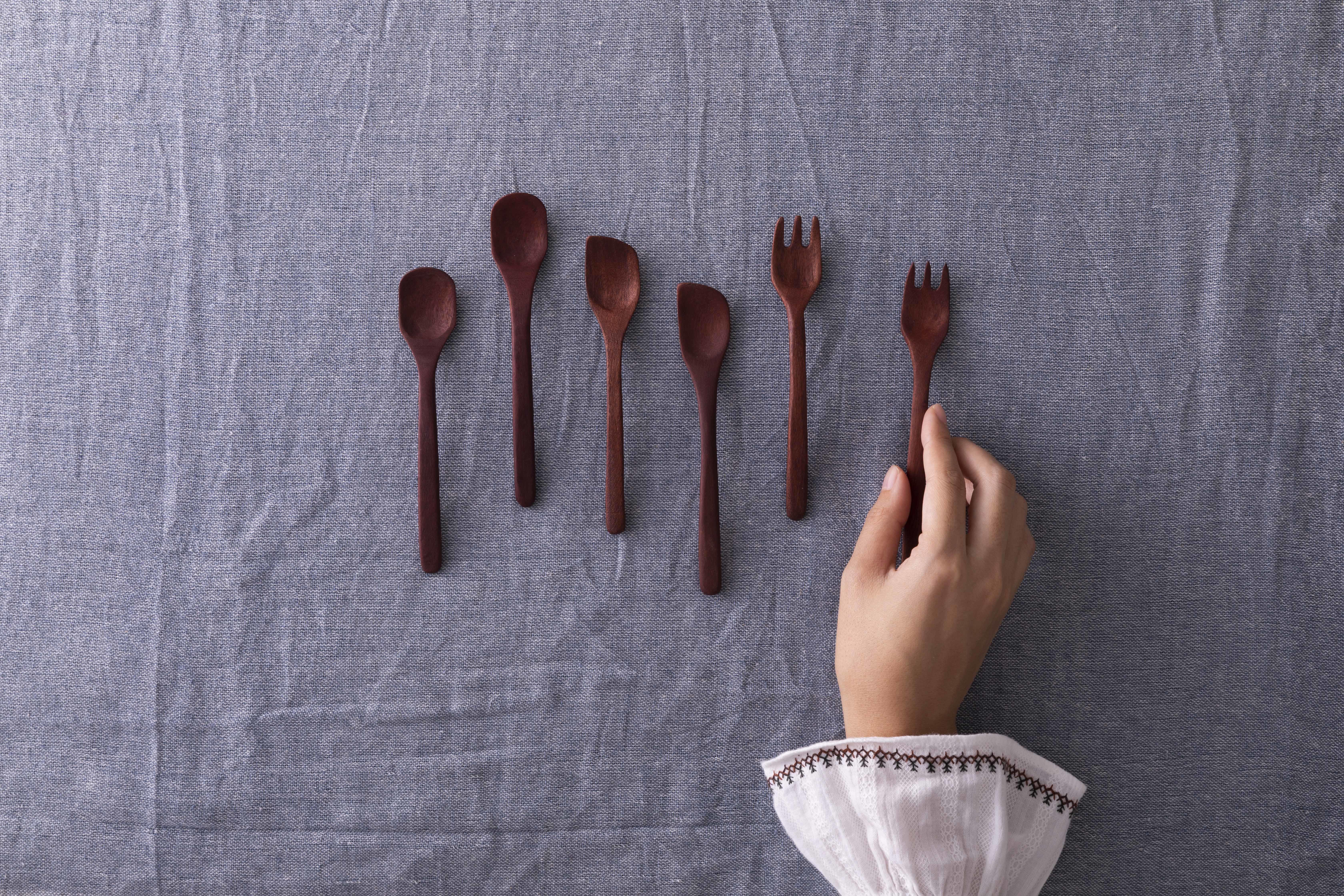 たとえば、「おと木工」のデザートスプーン。赤みがかった濃い茶色は、アカギという木の色で、素朴な雰囲気がなんとも可愛いです。そういえば、市販のアイスクリームに付いてくる平たいスプーンも、木だったのを思い出しました。あれで食べるアイス、おいしかったなぁ。