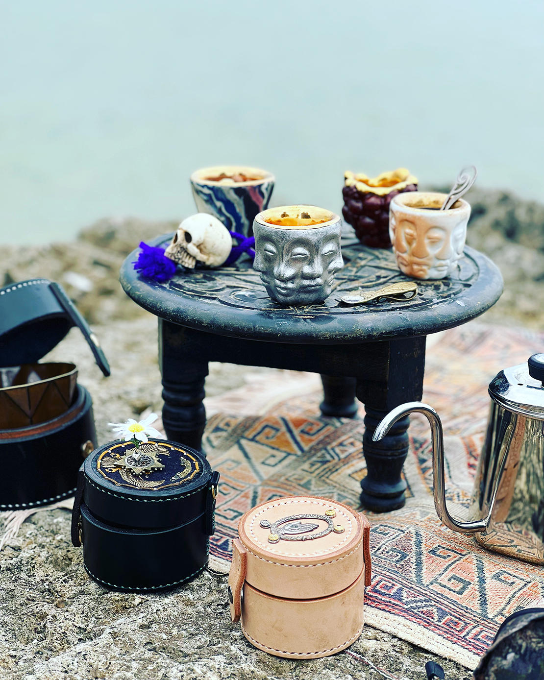 その道具のセレクトがとにかく俊逸でかっこいい。長く実家で愛用していたお気に入りのラグマットを敷いて、アンティーク調の味わいのあるテーブルを設置。その上には、友人に作ってもらったドクロのオブジェを飾り、革のオリジナルケースから、自作のデミタスカップを取り出す。いよいよ「エスプレッソの儀式」が開かれるのだ。