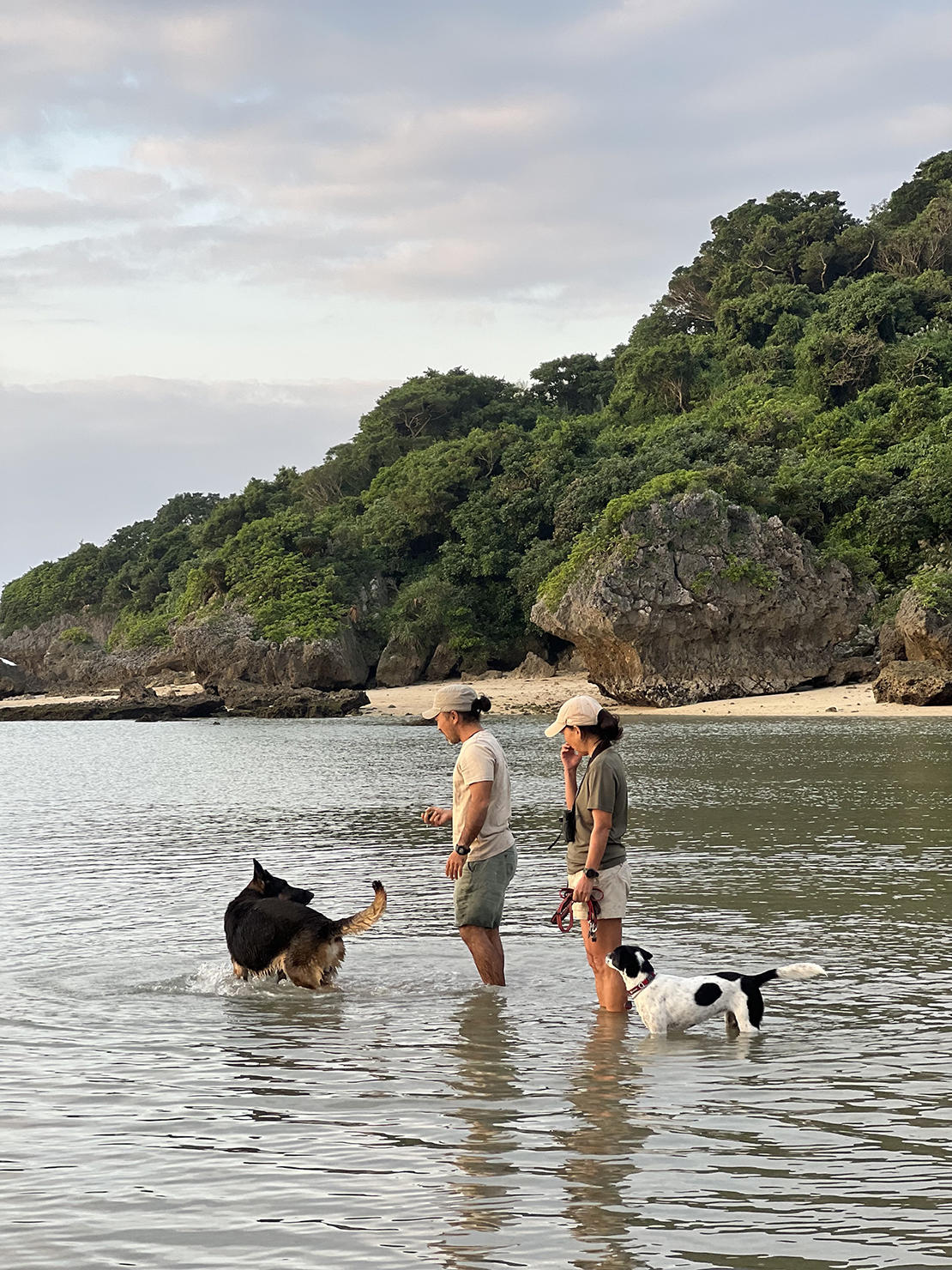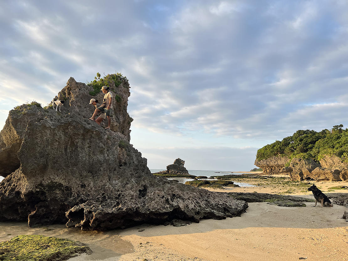 干潮時はキノコのような形の岩が顔を出し、よじ登ったりして楽しんでいるという。反対に満潮時は、肩まで浸かることもあるとか。そうなると散歩というよりもちょっとした冒険だけど、クロやキビは大はしゃぎ。