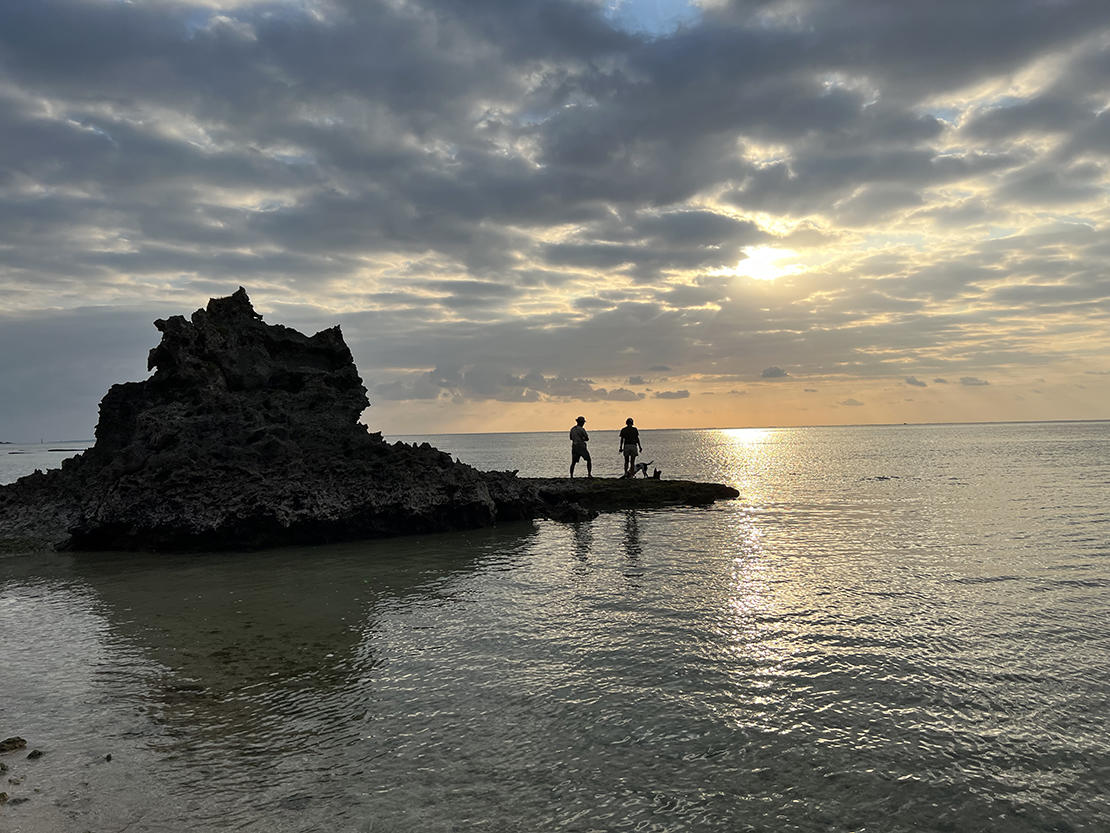 同行させてもらったのは11月の早朝。沖縄でもちょっと肌寒いなぁ、と感じる季節ではあったけど、二人の散歩はとってもワイルドで膝下まで海に浸かりながら、ザブザブと前に進んでいく。果てしなく続く海を眺めながら、時々、海岸沿いの植物を観察したり、空を見上げて鳴き声を頼りに鳥を探したり。沖縄にはたくさんの渡り鳥がやってくる。頻繁に通っていると、鳥の種類で季節がわかるというから、興味深い。