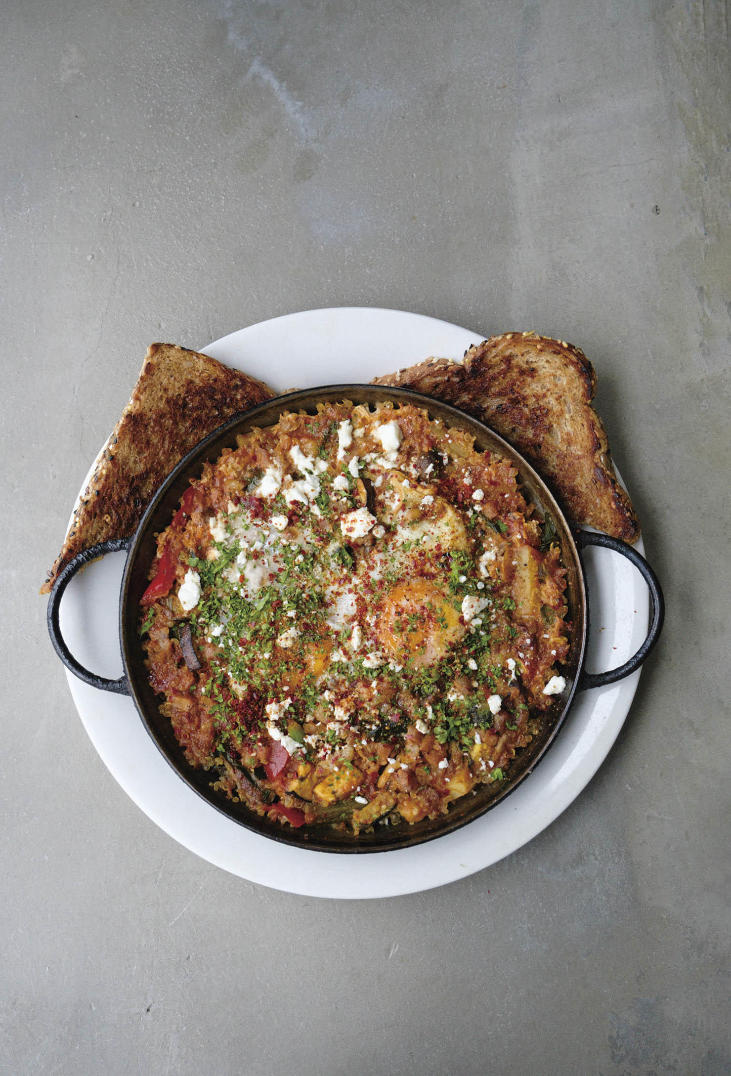 玉ねぎやトマトなどの野菜をニンニクで炒めてスパイスで煮込み、卵を落としたイスラエル料理シャクシュカ。カリッと焼いた雑穀パンと食べれば、スパイスの香りがふわりと。煮込まれた野菜はやさしい口当たり。カフェがあるのは那覇のオフィス街の一角。慌ただしい朝でも栄養満点の朝ごはんでやる気をチャージ。