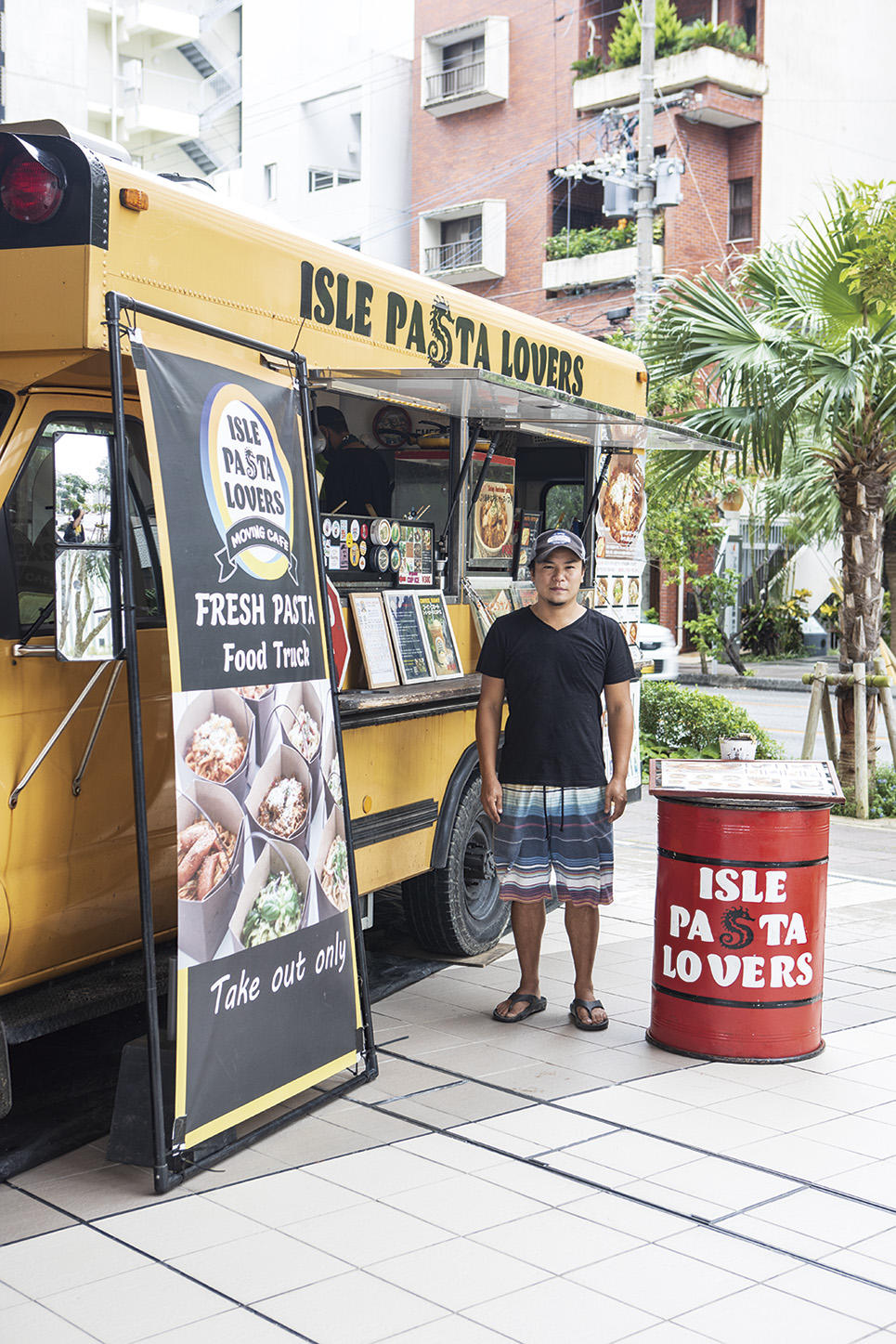 名護の三角屋製麺所の沖縄そばを使用した生パスタ専門のキッチンカー。麺は注文が入ってから茹でるので、生麺ならではのもちもちっとした食感がいきていて、とてもおいしい。メニューはパスタ以外にもピタサンドやドリンクも充実。