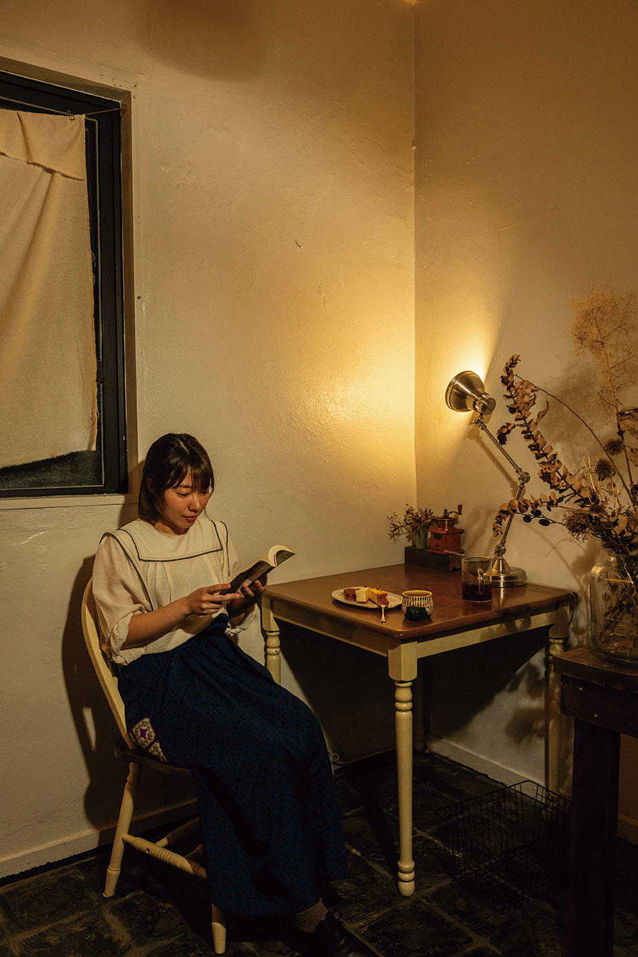 まずは、湯を沸かしながらお気に入りのカップや皿を棚から取り出す。 紅茶かコーヒー、 どちらにしようかと考えながら、今日のお菓子を眺めると、差し入れでもらったマドレーヌと余ってしまった自家製チーズケーキ2個にお取り寄せしたビスコッティ3本というラインナップ。それならきっと紅茶が合いそうだと思い、 ティーカップをチョイスした。 そして、自分のためだけに丁寧紅茶を淹れて、お菓子をかわいらしく皿に盛り付けたらおティーセットの完成。それを店内の中でも特に気に入っている席に運び、いよいよ『おティーの時間』の幕が開く。「夜遅い時間にこんなに食べるのと周りの人たちからはびっくりされますが、スイーツが大好きなのでペロリと食べられちゃいます。 ドリンクを飲んでほっと一息ついて、それぞれのお菓子をゆっくり味わって食べて。そうすると、その日の緊張がゆるゆるとほどけ、自分自身に「今日もよく頑張ったからご褒美だよ」なんて心の中で声をかけていますね。読書をしたり、アニメを観たり、 愛犬のぺちたろうとたわむれたり、ぼぉーっとしたり。時間を気にせず、心ゆくまでおティーを楽しんでいるんです」