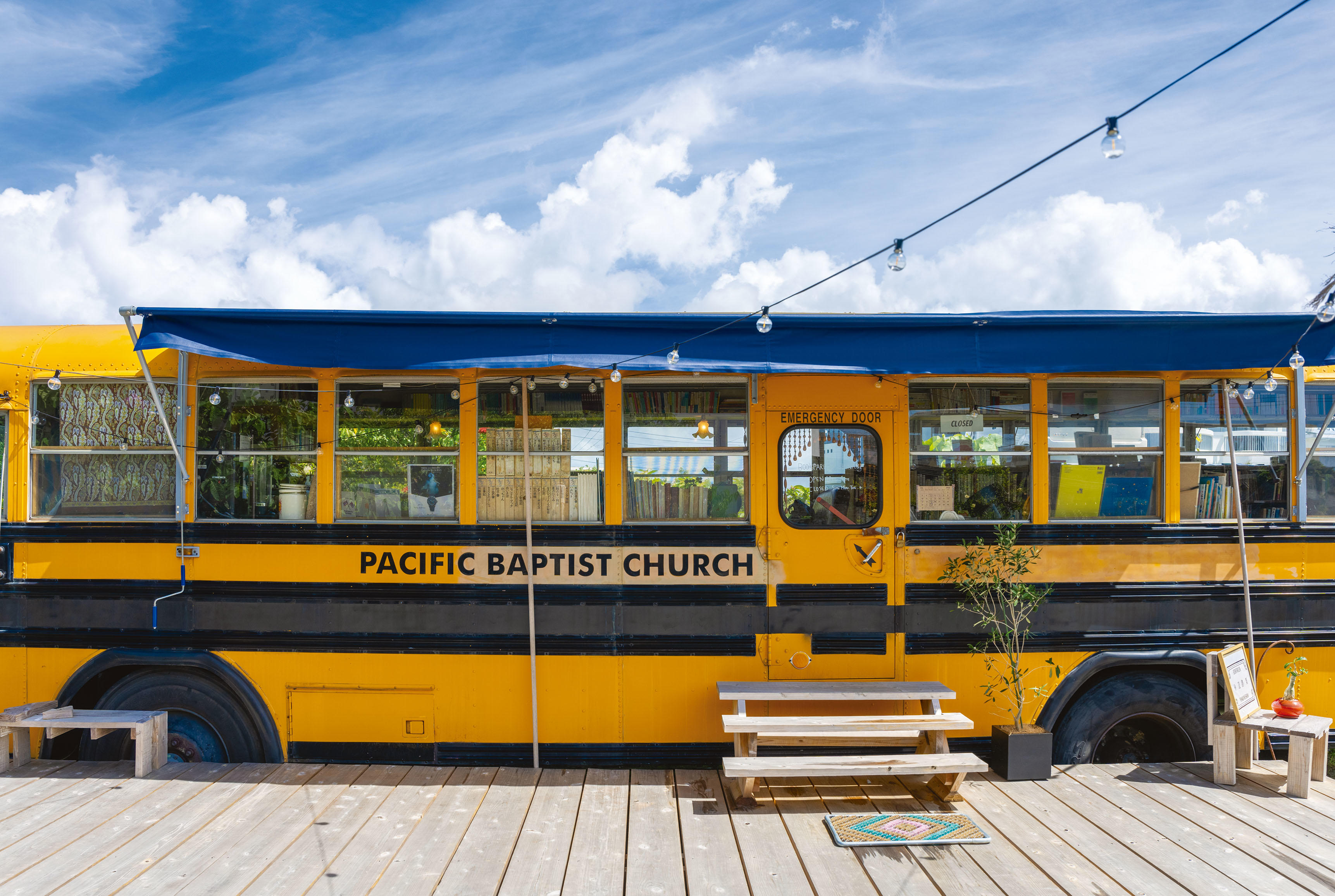 沖縄の歴史や文化を学べる、スクールバスの古書店。