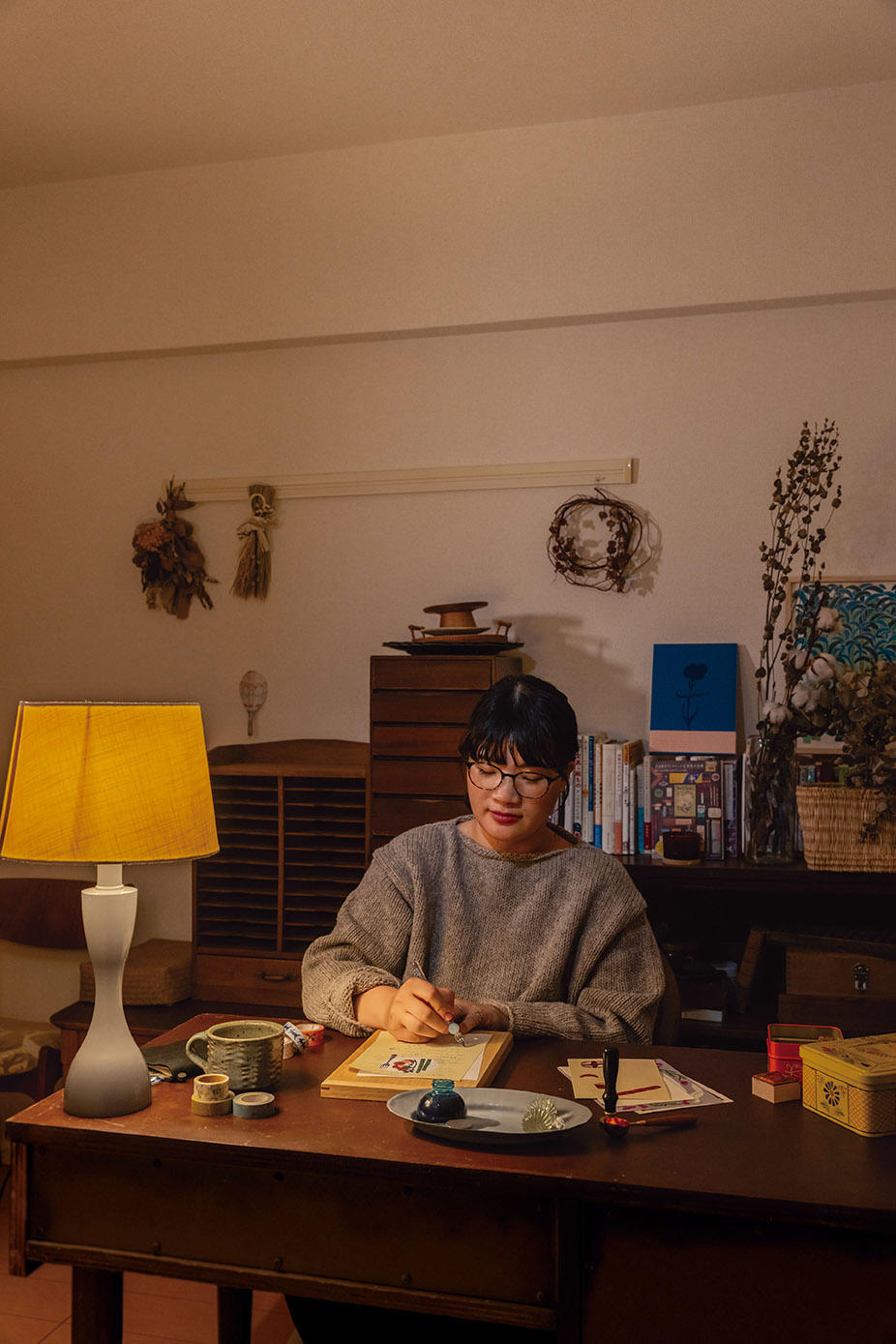 手紙にまつわる文具と雑貨のセレクトショップ「レタースタンドロロ」の岩下里実さんは、自身も手紙を書くのが好き。書くのは決まって、子どもたちが寝静まった夜だ。書き始める前には儀式というほどではないけれど、ちょっとした準備があって、家事が終わったら、 まずは音楽をかけて、自分時間へのスイッチをオン。最近はクラシックのピアノ曲やジャズピアノなどをスピーカーで小さく流すことが多いのだそう。自分のためだけにほっと落ち着く深煎りのコーヒーを淹れたら、おやつも用意して自室へ運んで机へと向かい、ゆっくりと椅子に腰かける。書く相手のことをイメージしながら便箋やマスキングテープを選び、お気に入りのガラスペンをインク瓶にひたす。書き出すとペンが止まることなく、するすると言葉が綴られていく。